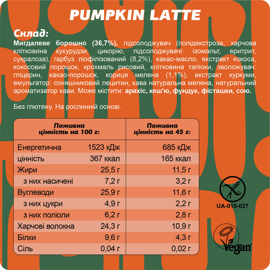 Склад: мигдалеве борошно (36,7%), підсолоджувач (полідекстроза, харчова клітковина кукурудзи, цикорію, підсолоджувачі: ізомальт, еритрит, сукралоза), гарбуз ліофілізований (8,2%), какао-масло, екстракт кокоса, кокосовий порошок, крохмаль рисовий, клітковина тапіоки, зволожувач: гліцерин, какао-порошок, кориця мелена (1,1%), екстракт куркуми, емульгатор: соняшниковий лецитин, кава натуральна мелена, натуральний ароматизатор кави. Маса нетто: 45г.